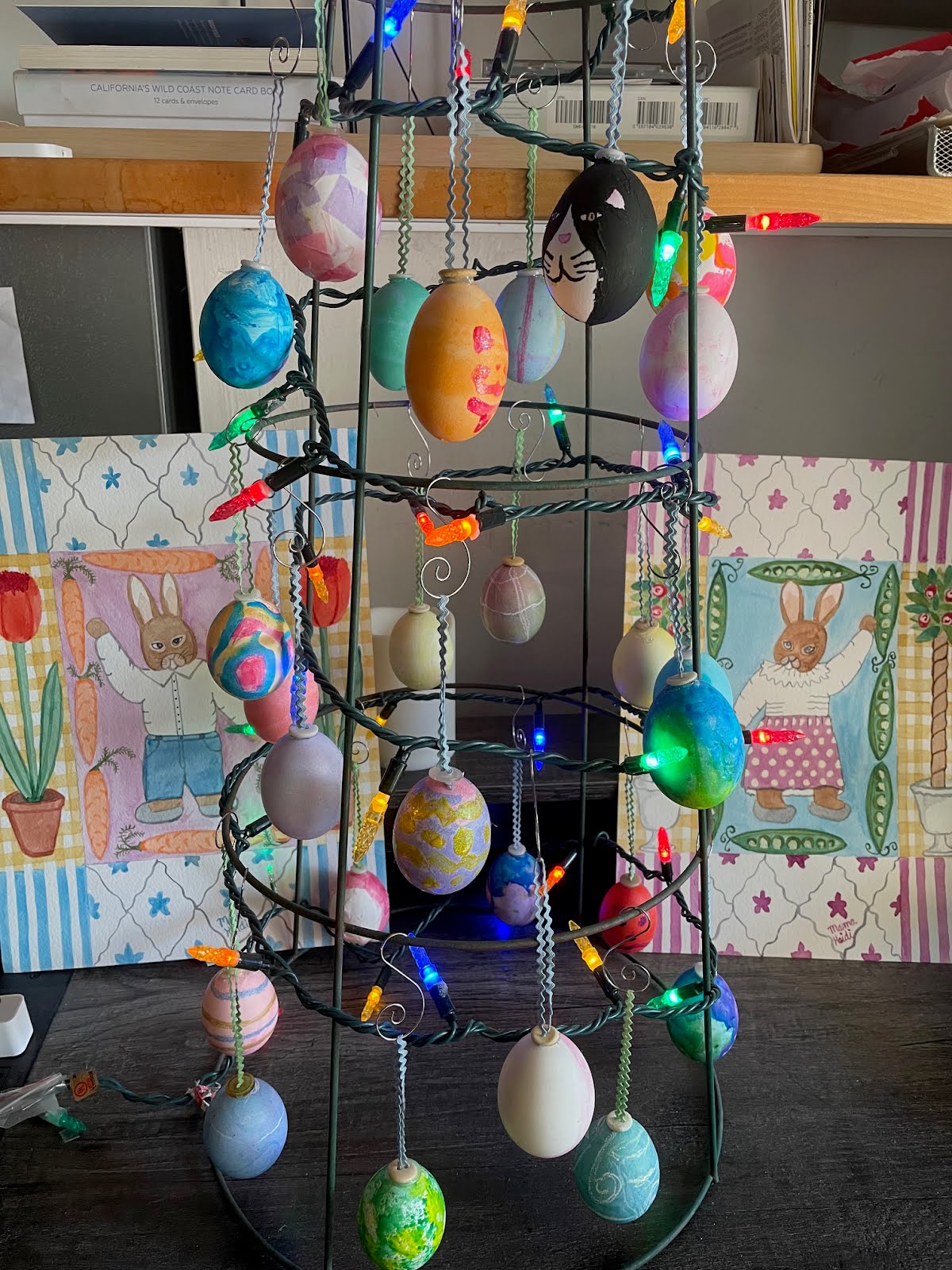 I painted these years ago when Ernest was little (the dude is 29 today!). The skirted rabbit is a copy of a catalog photo of a hooked rug. Thanks to the recent magic of google image search, I can credit the original artist Kelly B. Rightsell. I thought it needed a companion, with carrots of course, so I also made the jeaned rabbit. They’ve been tucked away for 20+ years but I thought they’d be fun to have out for Easter.